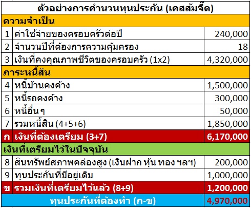 2. เงินประกันภัยที่มีอยู่เดิม เช่น เคยทำประกันภัยไว้ 1 ล้าน ก็หักออกจากทุนที่เราคำนวนจากข้อข้างบนได้ค่ะ