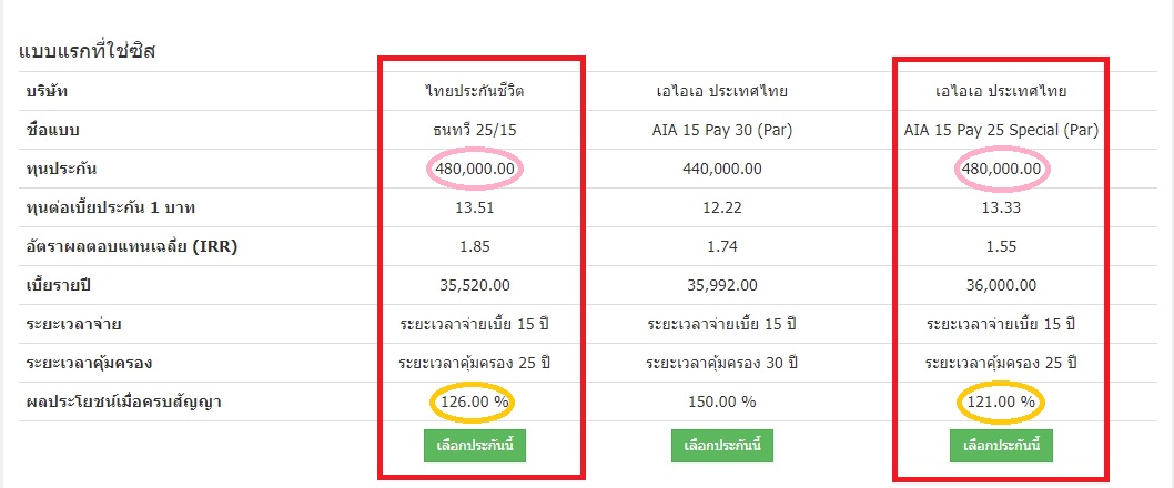 นี่เลยคร่า...จากการเลือกของเจ้าแม่ พบว่ามีประกันสำหรับเด็กผู้ชายแรกเกิดอยู่ 2 แบบที่มีระยะเวลาคุ้มครอง 21-30 ปี เน้นความคุ้มครองสูง (เลือกเงื่อนไขตอนค้นหาในระบบได้ตามใจเลยคร่า) ตามไอเดียที่เราคุยกันข้างบน คือ ไทยประกันชีวิต แบบธนทวี 25/15 และ 15 Pay 25 Special (Par) จ่ายเบี้ยปีละประมาณ 36,000 บาท หรือเดือนละแค่ 3,600 บาทเอง!!!