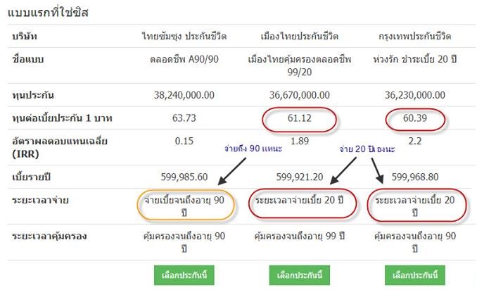 มาค่ะ มาดูตัวอย่างจากระบบนาคีของ ej-fin.com โดยเลือก ประกันตลอดชีพและดูวัตถุประสงค์การทำประกันเป็น "เน้นความคุ้มครองสูงสุด" อันนี้ตัวอย่างทุนประมาณ 36 ล้านชำระเบี้ยปีละ 600,000 บาท (อันนี้ซิสต้องลองเองด้วยนะคร้า เพราะอายุต่างกันก็ได้ผลแตกต่างกันนะเออ)
