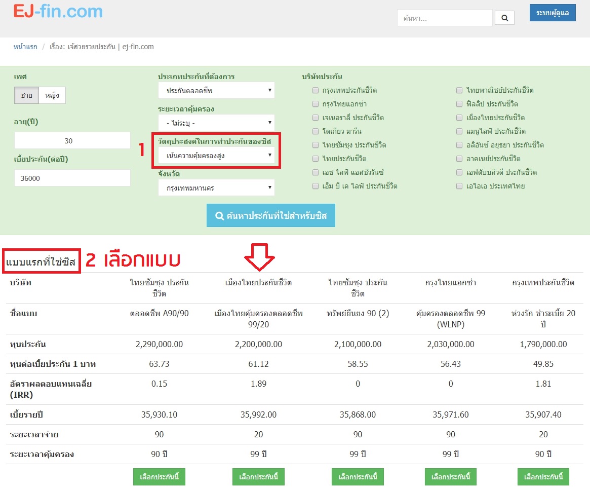 มาดูแบบจากระบบนาคีในเว็บ ej-fin.com ของเจ้กันคร้าา (ตรงเลข 2) เป็นไงคร้าามีให้เลือกหลายแบบเลยทั้งของไทยซัมซุงประกันชีวิต เมืองไทยประกันชีวิต กรุงไทยแอกซ่า และกรุงเทพประกันชีวิต ถ้าแบบยังไม่โดนใจ หรือมีบริษัทในใจซิสก็เลือกเองได้ง่าย ๆ คร่า โดยไปคลิกเลือกบริษัทได้เลย คลิกเสร็จแล้วก็อย่าลืมคลิกปุ่ม “ค้นหาประกันที่ใช่สำหรับซิส” นะคร้า ระบบจะได้หาประกันให้ซิสใหม่คร่า